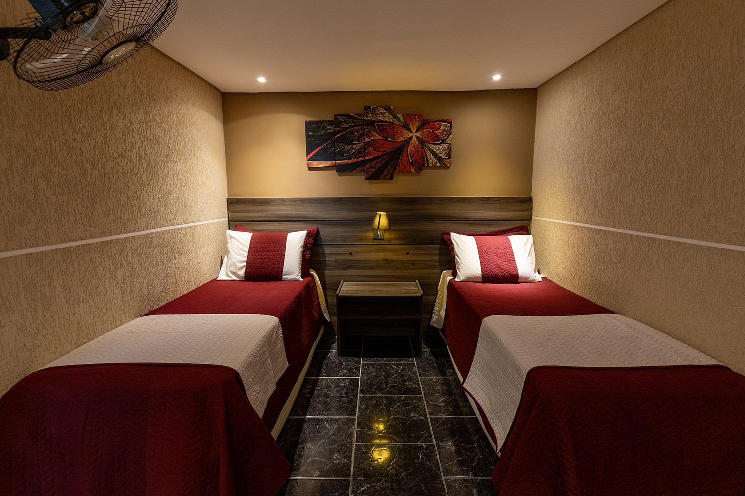 Oferece 2 camas de solteiro, TV Smart, ventilador e frigobar. Ideal para amigos ou colegas de trabalho.